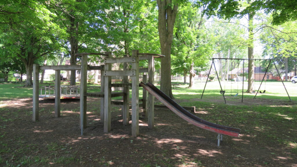 In the early 1920s, Flushing’s village council purchased this property from Clarence Luce to develop a water supply for the community, and a water tower and well houses once occupied part of the site. After the waterworks were relocated, farmer and auctioneer William Mutton was granted permission in 1927 to plant a commemorative tree grove here in honor of his wife. He planted 25 trees in 12 straight rows and tended them until maturity; this shaded grove still stands and gives the park both its character and its name.